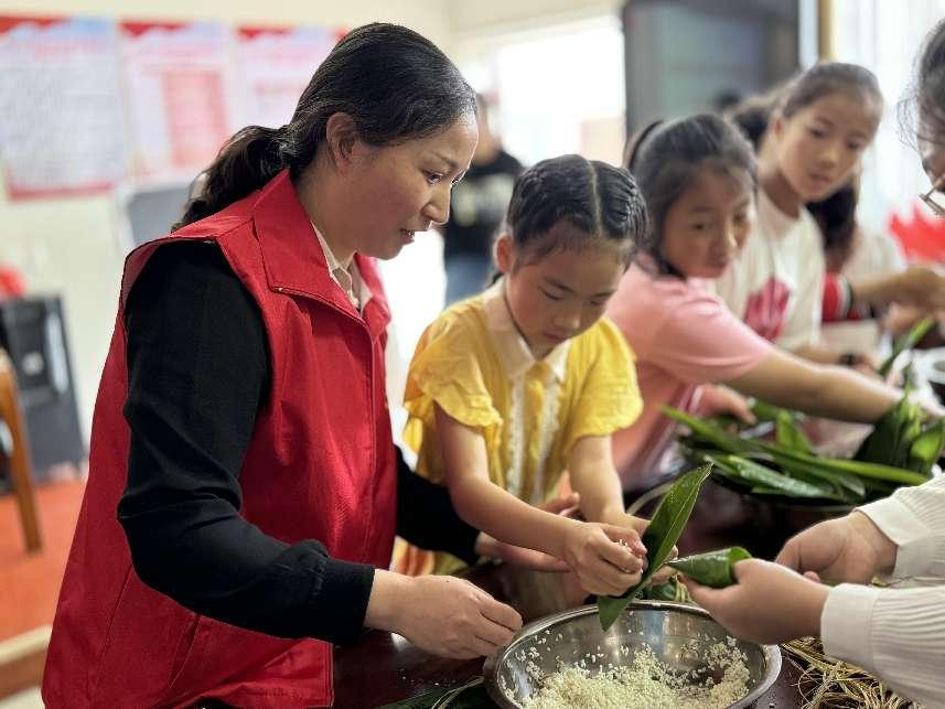 隨后,黨員同志們分發(fā)提前準備好的糯米、粽葉等,與孩子們圍坐在一起,挑粽葉、折粽葉、舀糯米、系粽繩……有的巧手翻飛、嫻熟地包著粽子,有的邊看邊學、逐漸熟練,不多時,一個個粽子就包好了,現場歡笑聲不斷。